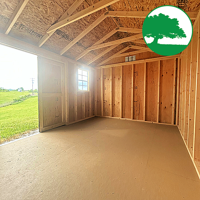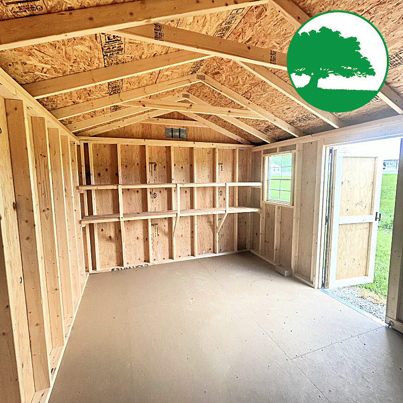 Features: Generous Roof Overhangs, 6’6″ Sidewall Height, Classic 5′ Double Doors, Double 10′ Shelf, (2) 24″ x 36″ Aluminum Windows w/ Shutters, 2″ x 4″ Floor Joists (12″ o.c.), Wall Studs (16″ o.c.), Rafters (24″ o.c.), DuraTemp Plywood Siding (50 Year Warranty), LP ProStruct Coated Flooring, 1/2″ OSB Roof Sheeting, Dimensional Shingles (30 Year Warranty) & FREE Delivery with blocks within 50 miles.