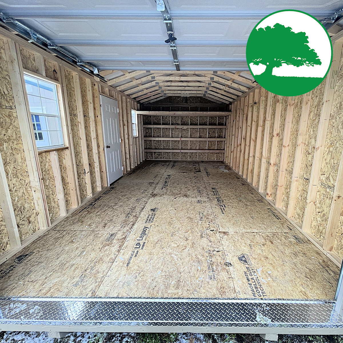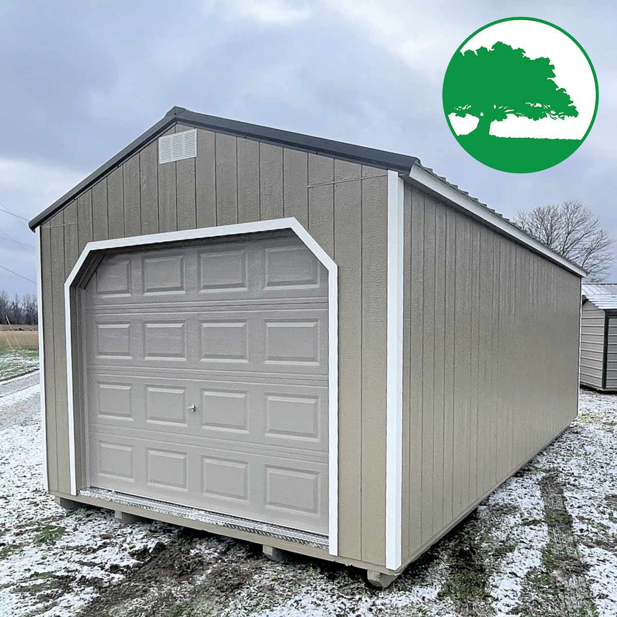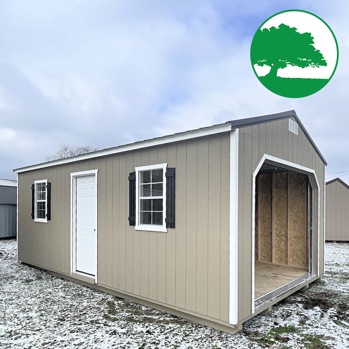 Features: 9′ x 7′ Roll-Up Door (Sandstone), 6 Panel (Solid) Entry Door, (2) 2′ x 3′ Aluminum Windows w/ Shutters (Black), 3-Tier OSB Shelving (16″ deep), 4′ x 12′ Overhead Loft, 8′ TALL Walls, 3-Tier OSB Shelving (16″ deep), LP SmartSide Siding (50 Year Warranty)