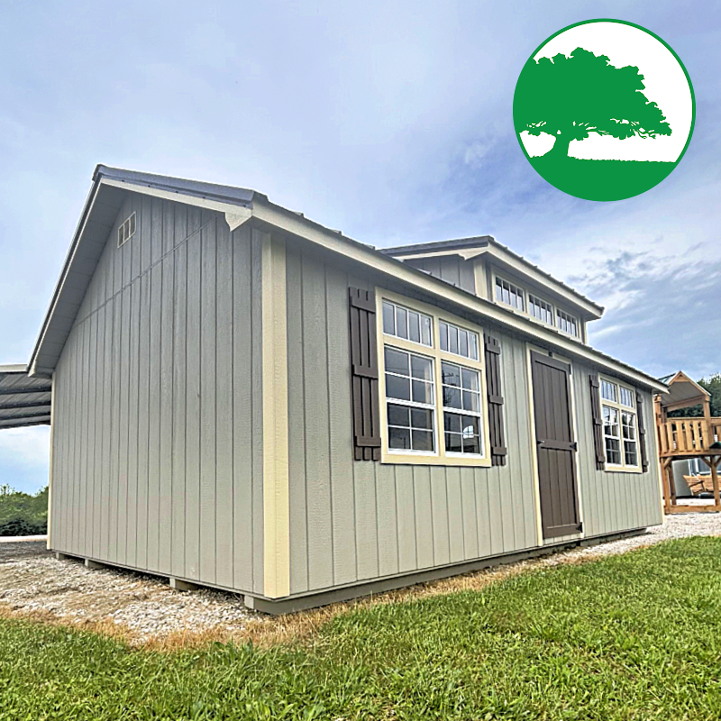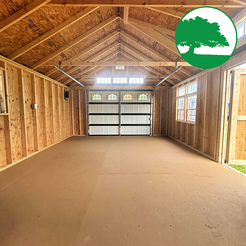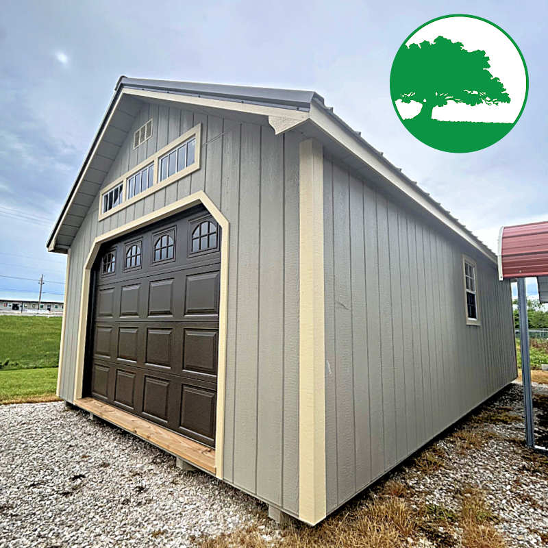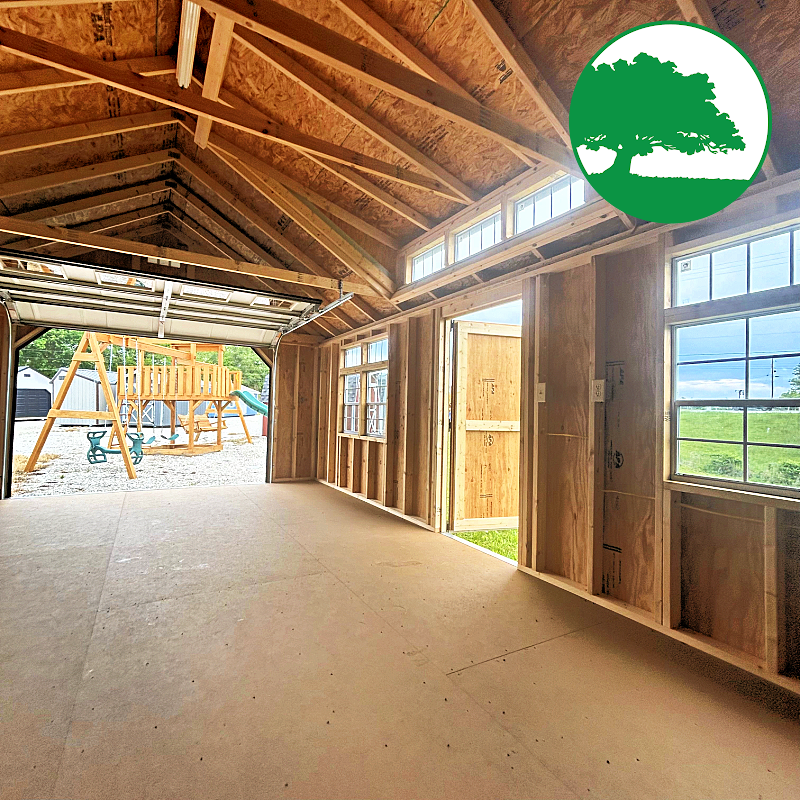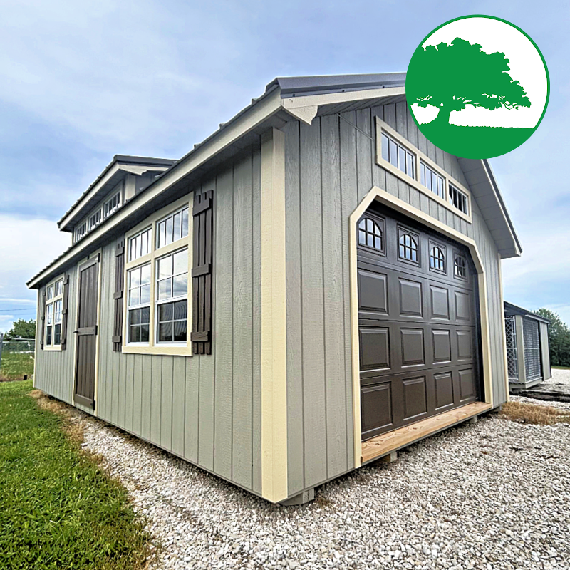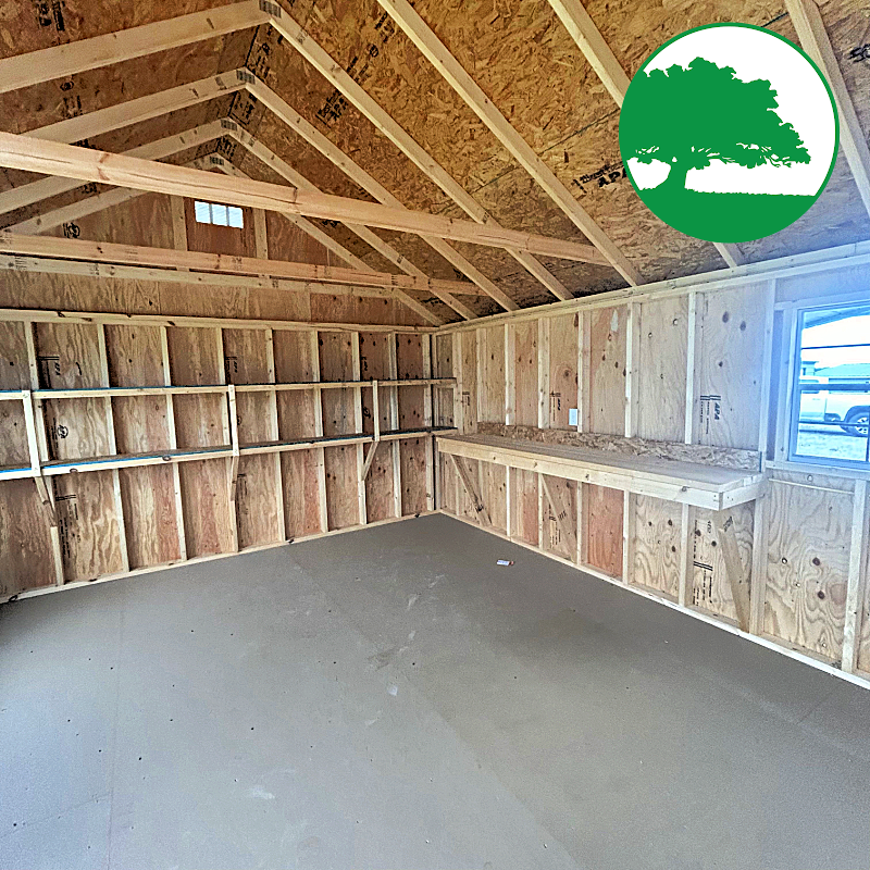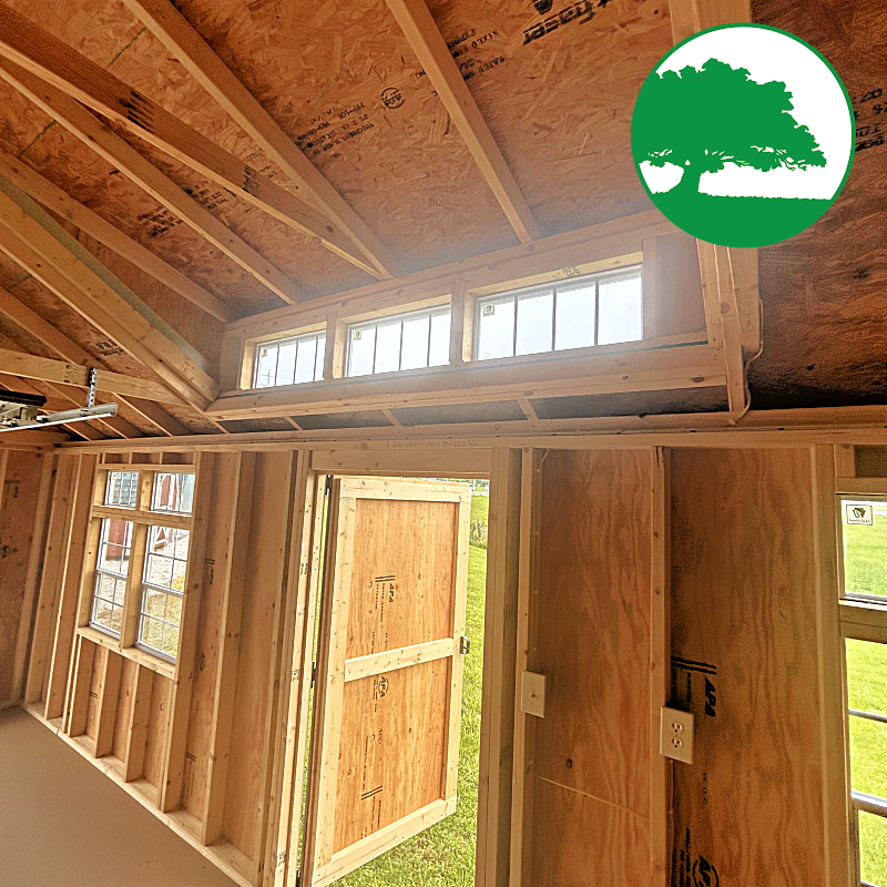 Features: Generous Roof Overhangs, 6’6″ Sidewall Height, Standard Electric Package (Box, (3) Outlets, Switch, 4′ Shop Light), Classic 3′ Single Wooden Door, 9′ Overhead Door (Brown), (5) 24″ x 30″ Aluminum Windows, (4) Transom Windows, 8′ Shed Dormer w/ Transoms, 14′ Double Shelf, 8′ Heavy Duty Workbench,  2″ x 4″ Floor Joists (8″ o.c.), Wall Studs (16″ o.c.), Rafters (24″ o.c.),  DuraTemp Plywood Siding (50 Year Warranty), LP ProStruct Coated Flooring, 1/2″ OSB Roof Sheeting, Metal Roof Upgrade (50 Year Warranty) & FREE Delivery with blocks within 50 miles.