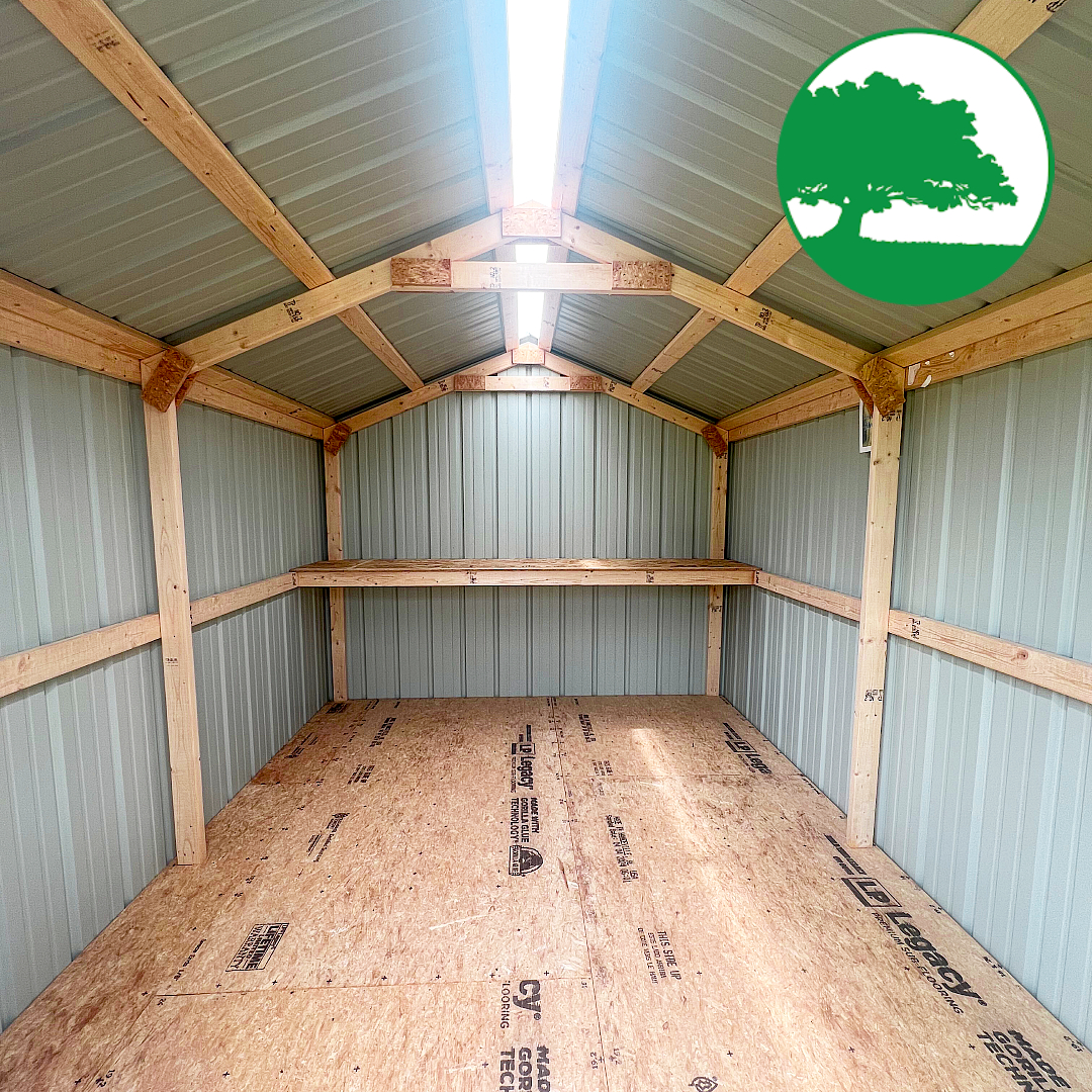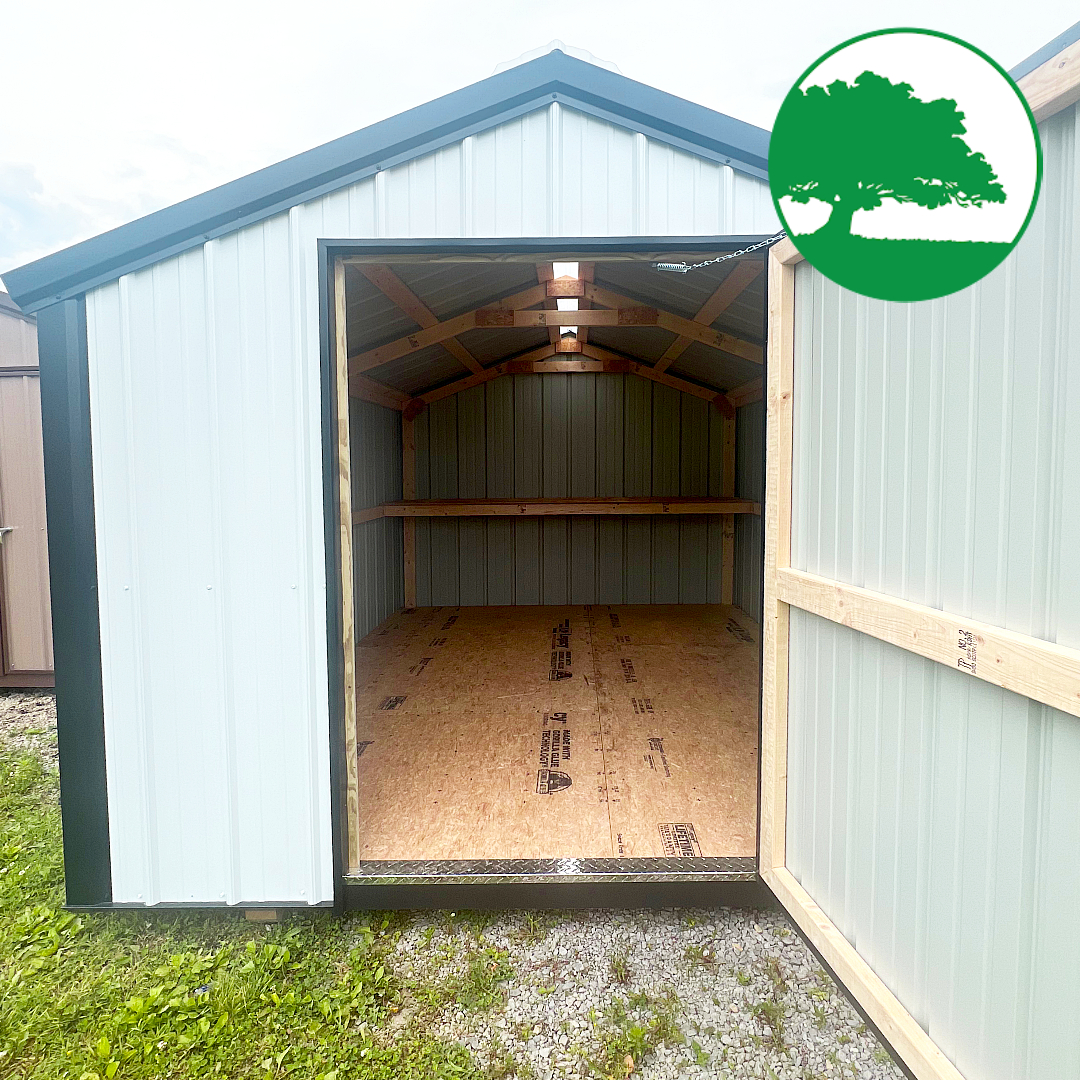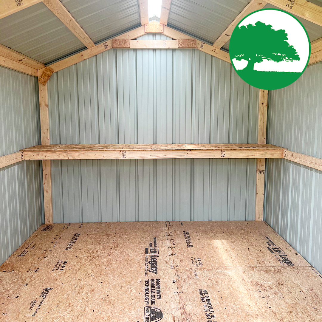 Features: Single Entry Door, Lighted Ridge Cap, 23″ Deep Shelf on Back Wall, Seal Tite Screws, LP Legacy tongue & groove Flooring
