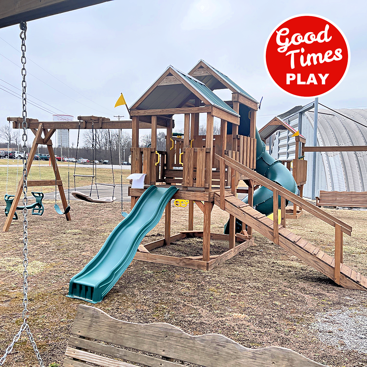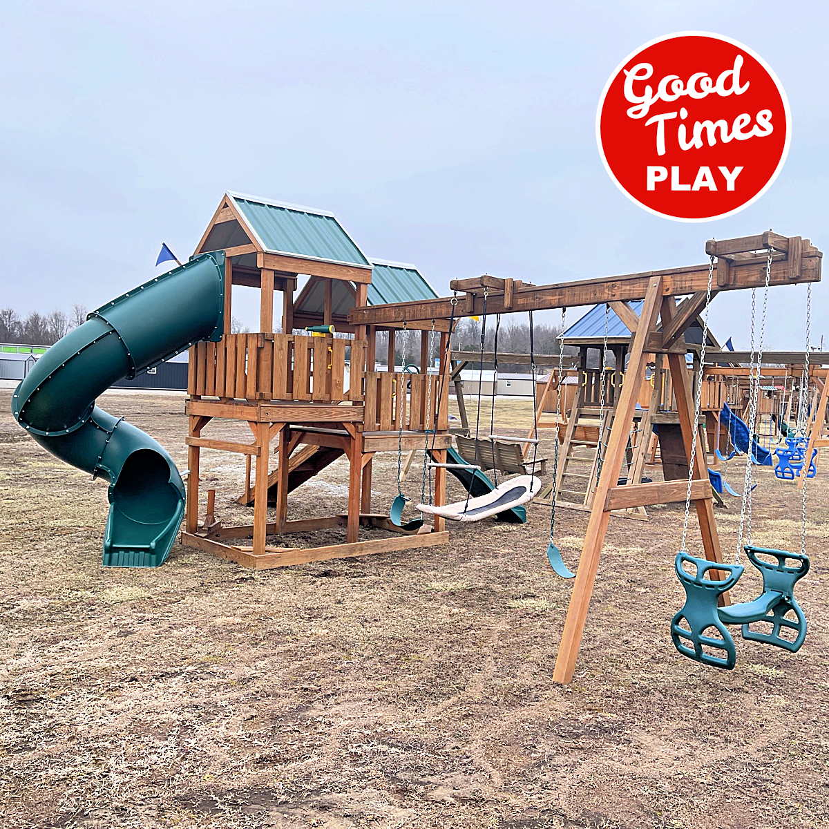 beams / accessories: 4 position swing beam with (2) belt swings, ski swing & ez ryder (2-kid swing)